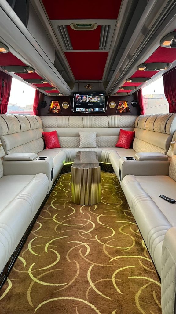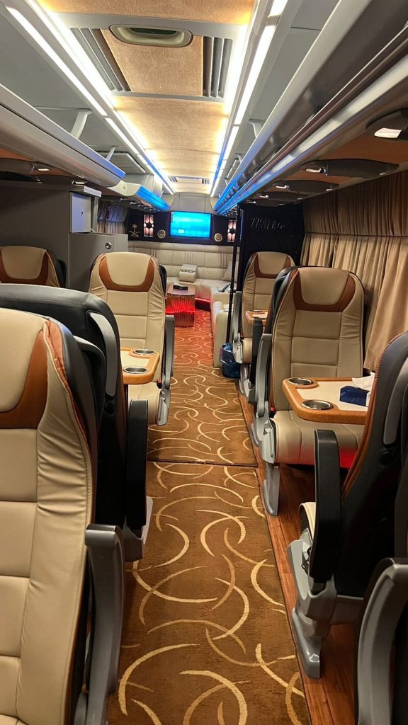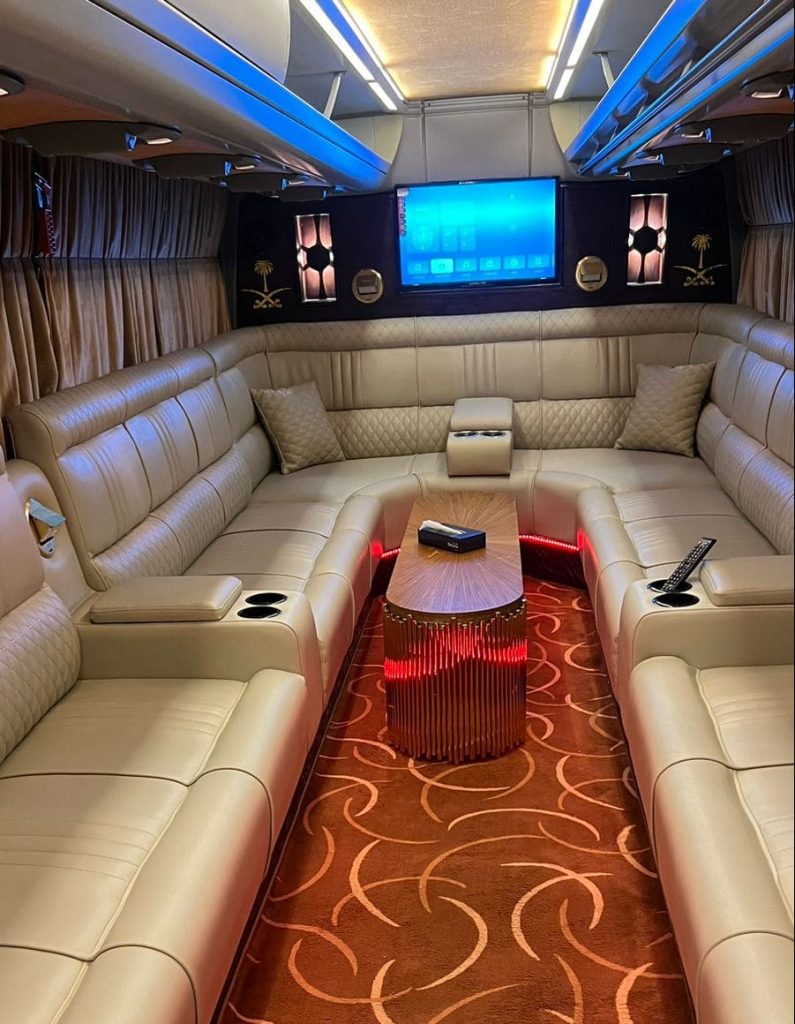 ملكي VIP مع طاولات وجلسة كنب وآلة كوفي وميكرويف، بالإضافة إلى شاشة عرض وخيارات إضاءة متعددة، يتسع لـ 25 راكباً.